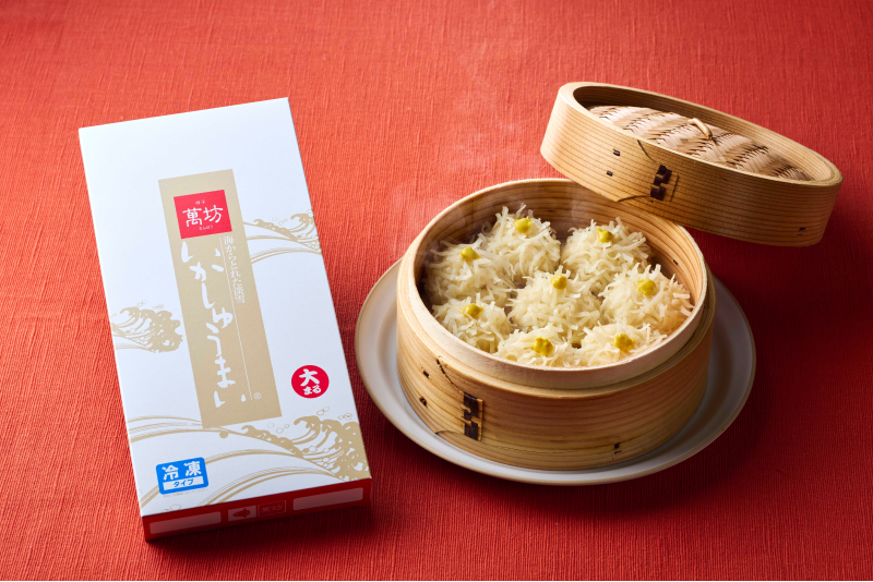 発売以来40年近く、萬坊人気ナンバーワンの商品「いかしゅうまい」は蒸しても、揚げてもおいしい一品。
